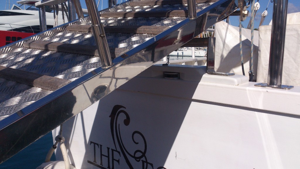 Escala real de acero inoxidable totalmente elaborada en Talleres Faro, y Escalón-Armario de acceso a Barco deportivo, en aluminio.