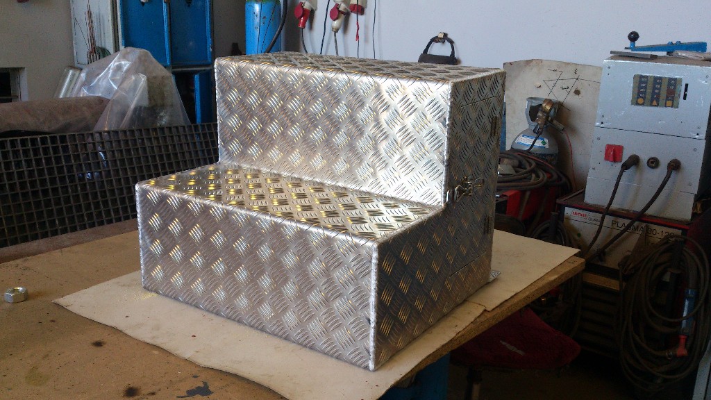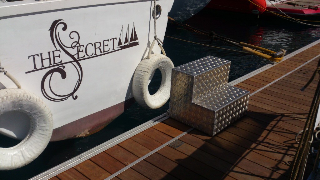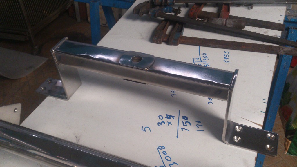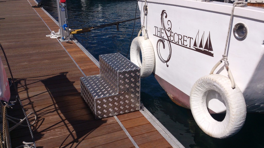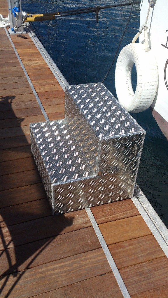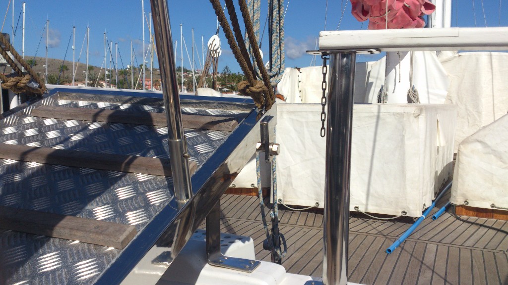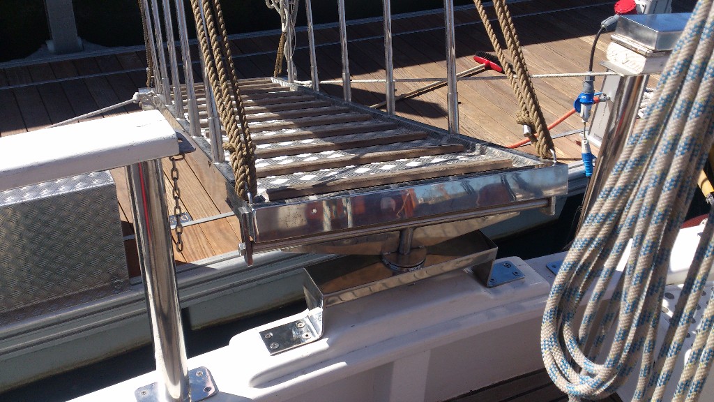 Escala real de acero inoxidable totalmente elaborada en Talleres Faro, y Escalón-Armario de acceso a Barco deportivo, en aluminio.